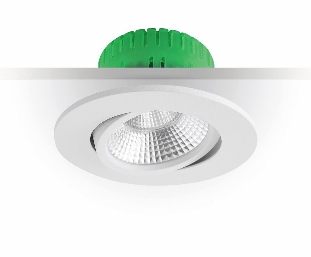 För infällt montage. Anslutes till snabbkopplingsplint 4x2,5 mm². Vippbar 28°. Armaturen är godkänd för montering direkt mot isolering. Komplett med drivdon. Dimbar med bakkantstyrd transistordimmer (RC).