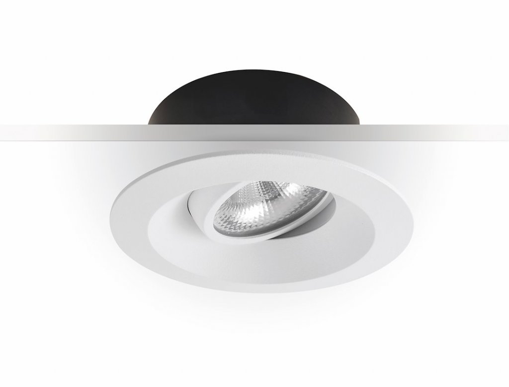 För infällt montage. Anslutes till snabbkopplingsplint 4x2,5 mm². Kan riktas 25° åt alla håll i 360°. Armaturen är godkänd för montering direkt mot isolering. Komplett med drivdon. Dimbar med bakkantstyrd transistordimmer (RC).