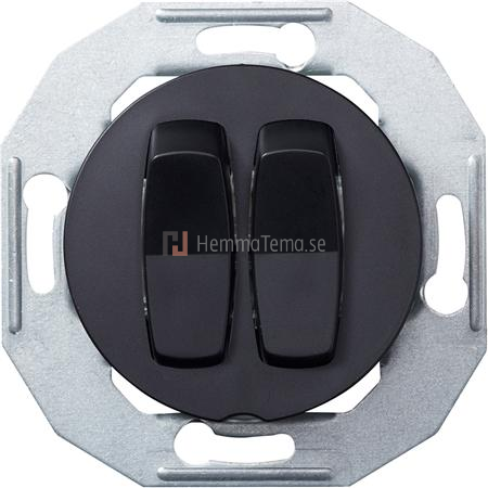 Renova Vippströmställare kron, 16 A, för montage i apparatdosa c/c 60 mm. Inkl fästklor. Vid utanpåliggande montage används dosa 22 mm, E18 311 95. Strömställaren har två neutrala överkopplingsklämmor. Snabbanslutning, kompletteras med valfri Renova ram. Svart