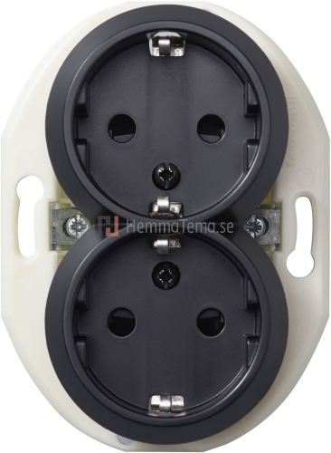 Renova 2-vägsuttags för infällt montage i apparatdosa inkl. fästklor. Renova 2-vägsuttag kan monteras utanpåliggande med en oval dosa för utanpåliggande montage. Renova 2-vägsuttag har skruvansluning med 2 st neutrala överkopplingsklämmor. Insats med centrumplatta, kompletteras med ram.