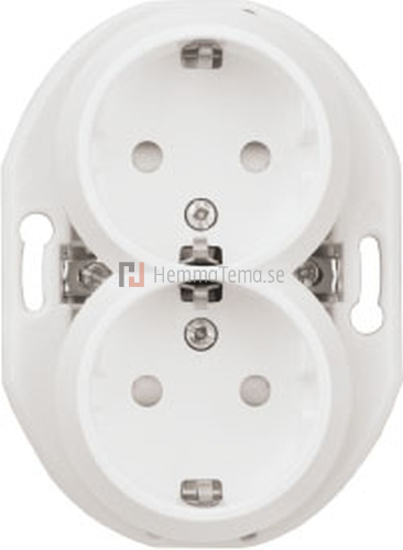 Renova 2-vägsuttags för infällt montage i apparatdosa inkl. fästklor. Renova 2-vägsuttag kan monteras utanpåliggande med en oval dosa för utanpåliggande montage. Renova 2-vägsuttag har skruvansluning med 2 st neutrala överkopplingsklämmor. Insats med centrumplatta, kompletteras med ram. Eljo Renova 2-vägsuttag finns i två olika färger, kåpor i andra färger finns att köpa till. Uttaget är tillverkat i termoplast.Kompletteras med en valfri Schenider Renova ram.